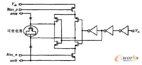 為了達到阻杭匹配,電路還需要對匹配網絡進行阻抗變換,這樣才能使得天線的內阻和射頻電路部分的輸人阻抗達到共扼匹配,因此我們采用了L型匹配網絡。由于芯片集成電感成本較高,而且精度較低,所以我們利用天線的電感作為匹配電感,將匹配電容集成到芯片中去。經過計算,該射頻電路的輸入阻抗約為 (105-j406)Ω。
