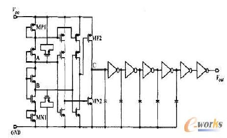 上電復位電路有兩個主要作用,一是當應答器進入詢問器或讀卡器的有效區域,電源電壓己經達到正常工作電位時,產生整個芯片的復位信號;其次是當電源電壓突然降低時,該電路可以通過復位防止邏輯電路出現功能錯誤。圖8是上電復位電路圖,該電路的上電復位延遲時間為10μs。當際從零開始不斷增大并超過起拉電壓2.4V時,P管MP1和N管MN1率先導通,使得A、B點電位從0開始隨著喻的增大而逐步上升,經過反相器,MP2和MN2管柵極電壓都隨著VDD的上升呈線性變化,所以在開始階段MN2導通,MP2截止,致使C點電壓一直為0(有效復位)。當VDD到達更高電位時,A點電位也同時上升到一定電平,使得MN2管截止,而此時MP2管導通,使C點電位迅速上升,經過幾級緩沖器,就得到了一個從邏輯0到1的跳變信號輸出,從而使電路開始正常工作。而后面的幾級緩沖器加電容負載的級聯是為了獲得大約10μs,的時間延遲,即當VDD高于2.4V且保持10μs后復位信號完成跳變,從而實現電路穩定工作,其仿真結果如圖9所示。