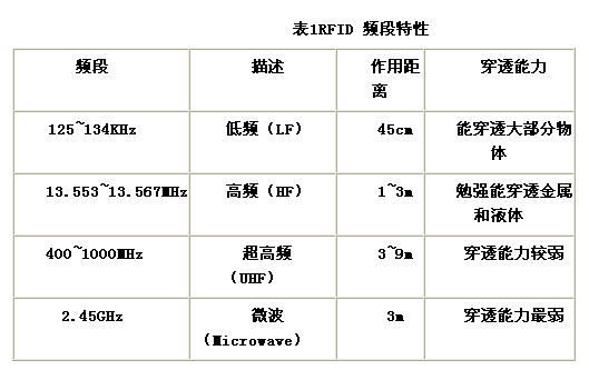 而高頻功率損耗與傳播距離的平方成正比。由于高頻以波束的方式傳播,故可用于智能標簽定位。其缺點是容易被障礙物所阻擋,易受反射和人體擾動等因素影響,不易實現無線作用范圍的全區域覆蓋。高頻頻段數據傳輸率相對較高,且通訊質量較好。表1為RFID 頻段特性表。