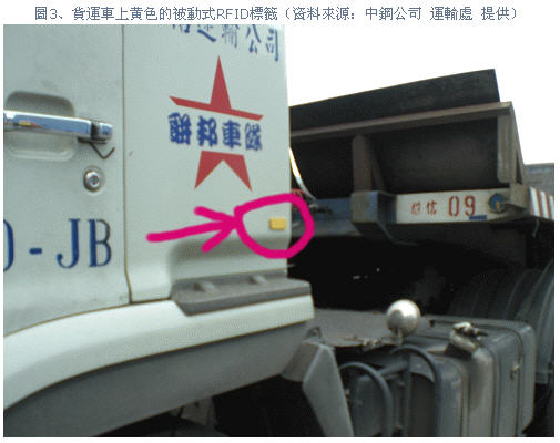 圖3、貨運車上黃色的被動式RFID標簽(資料來源:中鋼公司運輸處提供)