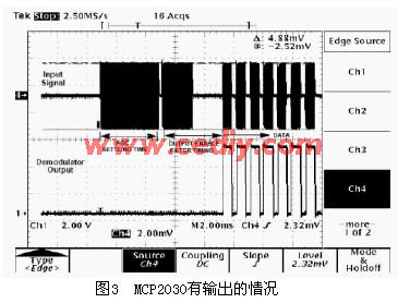 為使MCP2030正常工作,系統上電復位時要對該器件進行正確的初始化配置。在此設定無線信號數字濾波序列為2 ms有2 ms無,使能通道自動選擇功能和解調信號輸出功能,初始化程序段如下: