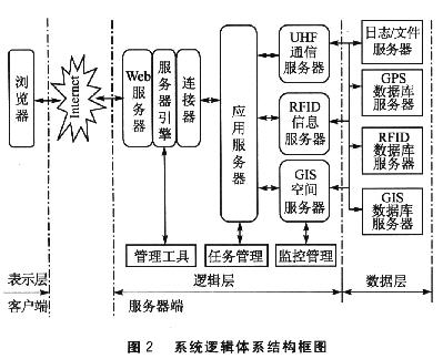 本系統服務器端管理軟件的開發采用了美國ESRI(Environmental Systems Research Institute)公司推出的第二代基于Web的GIS平臺——ArcIMS。ArcIMS體系結構由兩大部分組成——客戶端和服務器端,屬于典型的Browser/Server架構。系統邏輯體系結構可分為表示層、邏輯層和數據層,如圖2所示。