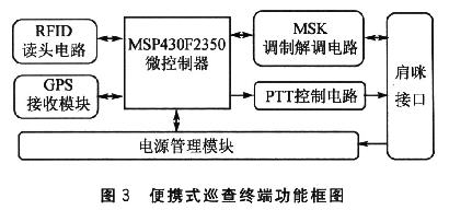 便攜式巡查終端主要完成對RFID標簽的閱讀,對GPS位置和時間信息的獲取,以及通過無線對講信道進行指令響應和數據傳輸。由于便攜式巡查終端依賴于現有的無線對講設備,因此在肩咪中實現這些功能模塊將能適應多種型號的無線對講設備,同時采用低功耗器件來減小便攜式巡查終端對無線對講設備電源功耗的影響。本設計采用MSP430F2350為主控芯片,功能框圖如圖3所示。