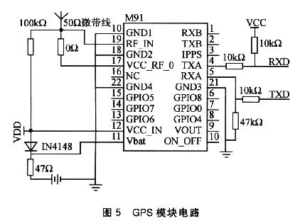 由于巡查終端是嵌入到肩咪中的,因此對GPS模塊的體積要求非常高。本設計綜合考慮GPS模塊的體積、功耗、定位精度,選擇了臺灣長天公司的M91 GPS模塊。該模塊采用了臺灣聯發科技GPS晶片組,尺寸僅為12 mm×12 mm×2.2 mm,32通道,靈敏度為-159 dB。另外采用S型四螺旋全向GPS天線,適合便攜式使用。GPS模塊電路如圖5所示。