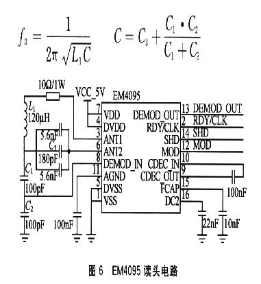 RFID讀頭電路采用了EM4095基站讀寫芯片,載波工作頻率為100~150 kHz,可以對EM400X、EM4050、EM4150等標簽進行操作。圖6為RFID讀頭電路原理,其工作頻率由以下關系式確定: