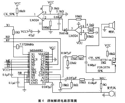調制解調電路采用MSM6882集成芯片,外加一些音頻信號處理及控制電路,原理如圖4所示。該電路一方面從揚聲器提取音頻信號,然后通過限幅放大電路后,將音頻信號送給MSM6882進行解調;另一方面,MSM6882對來自MCU的數字信號進行模擬FSK調制,然后將所得的模擬音頻信號送給對講機的音頻輸入端口,從而實現在對講機模擬話音信道進行數據的傳輸。由于目前城市巡查管理系統中無線話音信道受到周圍的干擾比較大,信道質量通常比較差,因此調制解調電路對數據無線傳輸影響非常大。