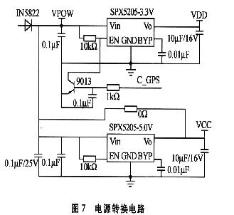 巡查終端工作所需電源來自對講機,由于不同型號對講機對外提供的電源電壓不同,因此為了終端的兼容性,必須對來自對講機的電源進行處理;同時由于主控:MCU采用3.3 V電源供電,而GPS和RFID采用5 V供電,這要求電源電路能夠提供相應電壓。為了給終端提供穩定的工作電源,采用SPX5205-3.3和SPX5205-5線性電源轉換芯片。電源轉換電路如圖7所示。