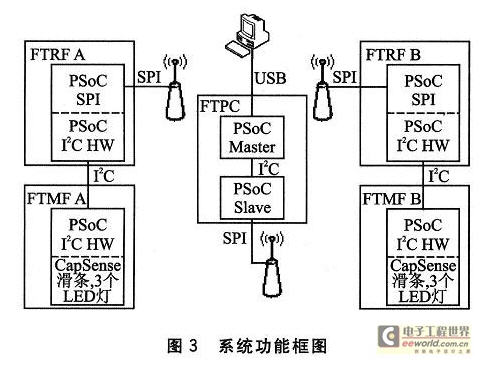 由于CyFi使用的是星型廣播式網絡協議,所有消息需要經過中心Hub,故實現節點A到節點B數據通信的過程如下:節點A通過I2C協議采集多功能板A的CapSense觸摸滑塊的位置、3個LED燈的亮滅情況等數據,并與目標節點B的ID號一起通過RF發送出去;Hub檢測到網絡中有消息后,再根據消息中的目標節點ID將消息轉發出去,同時將數據保存到緩存中等待PC機讀取;節點B接收到消息之后根據消息中的數據,同樣通過I2C協議控制多功能板B上的3個LED燈的亮滅。其中Hub所在設備FTPC有2個PSoC內核:主內核實現USB—I2C轉換和各個板卡(包括從內核)的編程功能;從內核實現Hub功能,同時通過I2C與主內核連接。系統功能框圖如圖3所示。