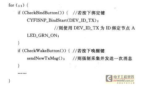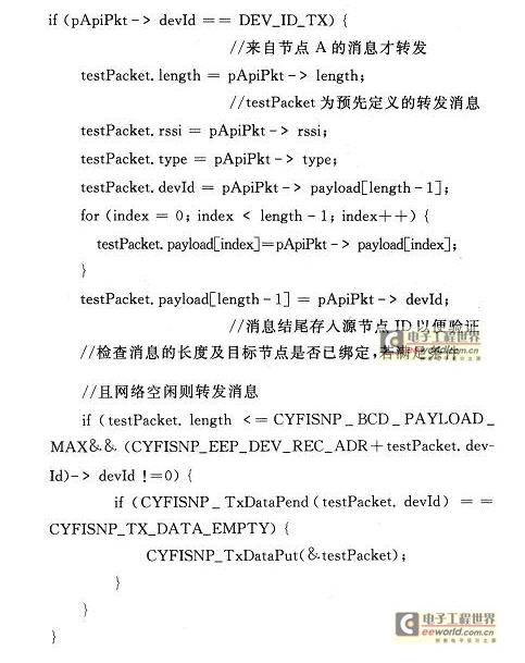 CY3271套件的光盤中提供了各個PSoC的設計樣例,本文中PSoC部分的設計就是在這些樣例的基礎上修改而成的。為了實現上述功能,需要在節點A發送的消息中添加目的節點B的ID信息,以便Hub將接收到的消息再轉發出去。每個CyFi收發器有2種ID;一種為6字節的Radio ID,此ID在收發器出廠時燒入,不可更改且全球唯一;另一種為1字節的Node ID,此ID在節點綁定時確定,可以事先指定也可以由Hub動態分配。由于Ra-dio ID較復雜,開發人員在開發過程中可以忽略RadioID,而只關注Node ID。