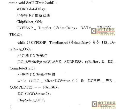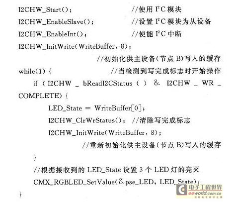 其中,負責接收消息并且控制多功能板B的函數receiveNewRxMsg()中必須與節點A對應的將消息類型修改為CYFISNP_API_TYPE_CONF_BCDR,且在其中調用的SetI2CData()函數如下:
