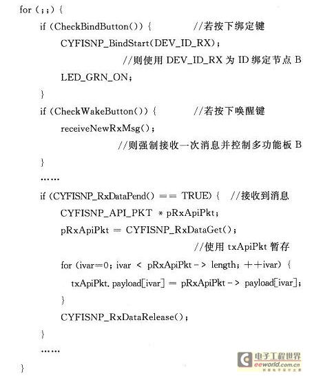 對于節點B使用的RF_I2C_BRIDGE樣例,其主函數同樣需要修改CYFISNP_BindStart()函數的參數,同時還需暫存接收到的消息。核心代碼如下: