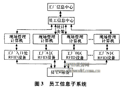 員工信息子系統如圖3所示,可以方便地實現員工出入工廠管理,考勤數據采集、統計和信息查詢以及廠區定位等功能。從管理層的角度考慮,簡化了管理結構,提高。廠管理的集中度,使管理層能夠集中、全面和隨時了解員工的有關情況。另外,分散的靜態手工資料向集中的動態化信息資料的轉化,提高了管理層次,改善丫管理效率,也為工廠的事后稽查、個體員工考察和整體人力資源政策的制定提供了參考依據。