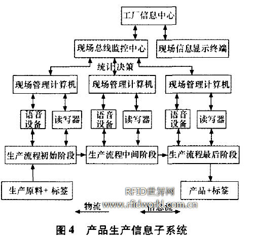 根據RFID在自動化生產線應用環境和其EPC(產品電子代碼)協議,在Rician fading(萊斯衰減)和AWGN(加性高斯白噪聲)復雜環境下,用脈沖寬度編碼和移動通信中應用較多的正交調幅調制方式,綜合設計了一種RFID系統框架 ,即產品生產信息子系統,如圖4所示