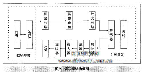 讀寫器是射頻識別系統不可缺少的設備裝置,是系統與諸多流動的電子標簽進行數據交換的工具,是系統運行的關鍵環節,其技術參數指標對系統的整體性能和可靠性有著決定性影響。硬件設計是決定讀寫器性能的關鍵,其目標是要達到閱讀距離遠、識別速率快、識別率100%的要求。經過研究發現,能夠采取一些措施提高閱讀器的性能。針對超市應用特點,我們設計了一個無源后向散射式RFID讀寫器。從構成上,它可以分作兩個部分,即射頻前端和數字基帶 。圖2為讀寫器結構框圖,射頻前端部分包括了發射電路、接收電路、環行器和天線;數字基帶包括DSP和FPGA芯片。其中,發射電路可以細分為載波電路、調制電路、放大電路,其工作過程如下:(1)載波電路通過鎖相環控制壓控振蕩器,產生載波頻率(860~960MHz),送至調制電路;(2)調制電路中混頻器將載波信號和讀寫器的基帶信號混合成調制信號,經過低噪聲放大器和濾波后,送至放大器;(3)讀寫器根據需要通過衰減器調節發射信號的增益,發射信號經過RF功率放大器后經環形器送至讀寫器天線發出。