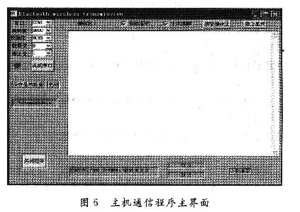 主機和藍牙接收模塊之間的數據傳輸采用RS 232串口連接。采集到的數據通過藍牙傳輸到接收模塊之后,通過RS 232接口傳輸到主機上。接口硬件采用金甌公司的藍牙模塊RS轉換器。通信軟件由VC編寫,將傳感器節點測量的數據通過藍牙傳輸到主機,顯示出來以便進行數據處理。主機通信程序主界面如圖6所示。