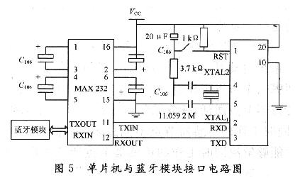 這里有一個電平轉換的問題。單片機發出的信號是TTL信號,所以在與藍牙模塊進行數據前,需要把它轉化成RS 232電平。本系統中采用MAX232進行電平轉換。接口電路圖如圖5所示。