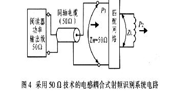 本文研究的RFID讀寫器頻率為13.56 MHz,為有效抑制功率反射、寄生輻射等高頻效應,通常是將讀寫器天線通過同軸電纜連接到讀寫器的高頻模塊,同軸電纜阻抗為50 Ω。因此,天線的阻抗匹配就是通過一定的無源匹配電路來改變讀寫器天線的輸入阻抗,使其與同軸電纜的阻抗保持一致,這樣就可使能量通過同軸電纜幾乎無損失的從讀寫器傳送出去。圖4為采用50 Ω技術的電感耦合式射頻識別系統電路。