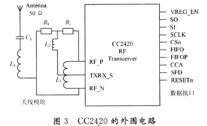 射頻芯片采用TI-Chipcon公司生產的CC2420,CC22420是為無線傳感器網絡設計的,符合2.4 GHzIEEE802.15.4的一款射頻芯片。它基于Chipcon公司的smartRF03技術,以0.18 9m CMOS工藝制成,只需極少外部元器件(如圖3所示),性能穩定且超低電流消耗(RX:19.7 mA,TX:17.4 mA)。CC22420的選擇性和敏感性指數超過了IEEE802.15.4標準的要求,抗鄰頻道干擾能力強(39 dB),可確保短距離通信的有效性和可靠性。