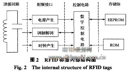 RFID標簽(Tag,即應答器)I 用于標識目標對象,由耦合元件及芯片組成。RFID標簽芯片基于“RF+Logic Controller+EEPROM”架構,芯片可劃分為諧振回路、射頻接口電路、數字控制和數據存儲體4部分,其內部結構如圖2所示。