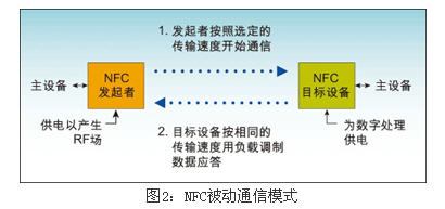 支持NFC的設備可以在主動或被動模式下交換數據。在被動模式下,啟動NFC通信的設備,也稱為NFC發起設備(主設備),在整個通信過程中提供射頻場(RF-field),如圖2所示。它可以選擇106kbps、212kbps或424kbps其中一種傳輸速度,將數據發送到另一臺設備。另一臺設備稱為NFC目標設備(從設備),不必產生射頻場,而使用負載調制(load modulation)技術,即可以相同的速度將數據傳回發起設備。此通信機制與基于ISO14443A、MIFARE和FeliCa的非接觸式智能卡兼容,因此,NFC發起設備在被動模式下,可以用相同的連接和初始化過程檢測非接觸式智能卡或NFC目標設備,并與之建立聯系。
