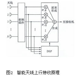 智能天線系統的工作機理概念可以用圖2 和圖3 予以描述。在圖2中,N個天線輻射單元接收到信號經過射頻放大后,在基帶的數字波束成形(DBF)網絡中采用Wi的復權系數加權并進行疊加合成,然后進入接收機,其中DSP智能算法處理器根據N個天線輻射單元來波的幅度/相位關系預測出有用信號的方向。疊加合成得到最大的接收信號。在圖3中,DSP根據上述預測的有用信號方向以及預測的干擾信號方向,可以自適應產生合適的Wi復權系數,并激勵各個天線單元的輻射,從而將主瓣板對準有用信號,將零點對消。