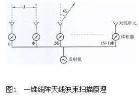 首先,作為最基本的一維波束掃描相控陣天線是一個等間距排列的直線陣列(見圖1),其中陣列的每個輻射單元的激勵相位可以變化,即當相鄰輻射單元的激勵相位呈特定的等差級數變化時,陣列方向圖是通過對每一列天線單元的幅度相位激勵進行調整實現波束掃描的。