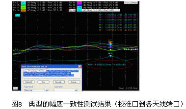 針對第3項測試(共需要9個端口),R&S ZVT只需要兩步就可完成(如圖6和圖7所示),同時結合Trace Math(軌跡計算,對多個軌跡進行任意的計算,以擴展測量功能)功能,可以實時的計算并顯示各通道幅度/相位一致性(如圖8所示)。