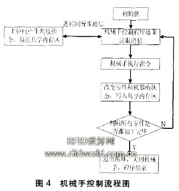 機械手運動主要有三種:有新的零件產生,這時機械手控制程序從緩沖區找出一個空位,控制機械手把零件從初始緩沖區抓到這個空的緩沖區位置上;有零件要在機器上加工,這時機械手從緩沖區有零件的位置上抓取一個零件去機器旁的讀寫器上掃描,若是要加工的零件,把它放到機器上,若不是,重新放回緩沖區的原來位置上,再從下一個位置抓取,直到找到要加工的零件;有零件在機器上加工完畢,若是這個零件的所有工序都加工完畢,把這個零件抓出系統,若不是,從緩沖區找一個空位,把零件從機器上放到讀寫器上掃描,確認加工完畢,然后放到那個空位上。最后機械手做完以上的三種中的任意一種動作時,零件和機器的狀態都會發生改變,監控程序把更新后的狀態數據寫入共享內存區。圖4是整個控制程序的流程。