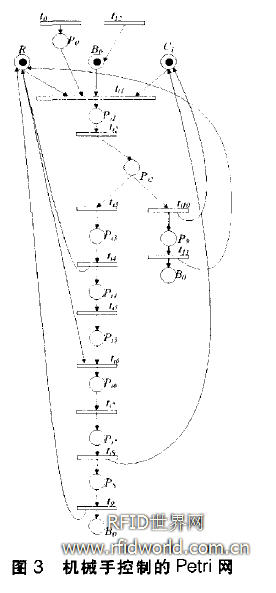 在本實驗系統中是3臺機器共用一個機械手,且有一公共緩沖區,因此R(機械手空閑庫所)與B。(緩沖區中有加工任務所指定的零件)是共享庫所,需要由這兩個庫所各引出一條弧指向與每臺機器相關的t. (機械手抓取并移動零件)變遷。與各機器相關的t. 變遷會由于競爭托肯而發生沖突,當這些變遷被使能時,需按照調度指令確定的順序依次觸發。避免死鎖是離散制造系統控制的基本要求,與基于局部可達樹預測分析的死鎖避免算法不同的是,由于本實驗系統的邏輯結構較為簡單,這里采取了一種通過控制在制品數量以避免公共緩沖區被填滿的簡單方法來避免死鎖。