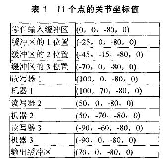 圖5是根據機械手的運動范圍定義的本實驗系統的平面布局圖,原點就 :是機械手的機械原點,(0,400)是機械手回零后的點,機械手的第一軸和第二軸的長度都是200mm。表1是這些點對應的機械手的關節坐標空間里的四個軸的關節坐標值。表1中定義的坐標值是關節坐標,例如:緩沖區的1位置(-25,0,-80,O) 里面的四個值代表四個軸的關節坐標值,第一軸相對于零點(即機械手回零后的位置)轉-250,第二軸不動,第三軸相對于零點下降-80cm,第四軸不動。