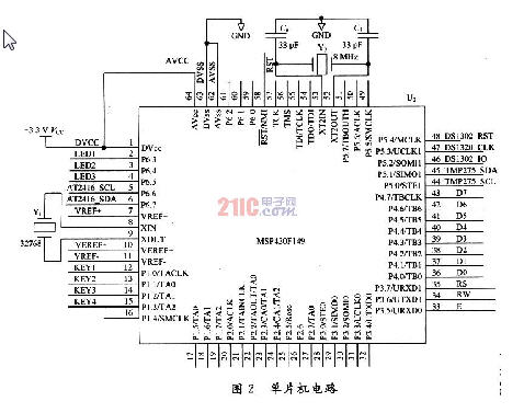本系統的控制電路采用MSP430F149單片機,MSP430F149共有五種低功耗模式,即低功耗模式O(LPMO)至低功耗模式4(LPM4),非常適合手持設備的低功耗要求,具體電路如圖2所示。由圖2可看出,單片機的P1.O,P1.1,P1.2,P1.3作為通用I/O口接鍵盤,P4口和P3.5,P3.6,P3.7分別作為LCD液晶顯示器的數據與控制連接端口;單片機的P5.1,P5.2接TMS275溫度傳感器芯片,P5.2,P5.3,P5.4接DSl302芯片引腳,P6.6和P6.7接AT24C16芯片引腳,三個芯片都使用軟件模擬I2C總線協議,P6.3和P6.4接LED起指示作用。