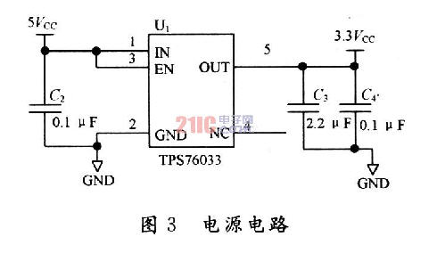 由于MSP430系列單片機的工作電壓一般是l.8~3.6 V,并且功耗極低,因此選用TI公司的TPS70633作為電源芯片。該電源芯片輸出為3.3 V,電流為50 mA,完全能滿足大多數低功耗應用場合的要求。圖3為具體電路,由圖3可以看出:該電路非常的簡單,只需要簡單的外圍器件。為了使輸出電源的紋波小,在輸出部分用了一個2.2μF和0.1μF的電容,另外在芯片的輸入端也放置一個2.2μF的濾波電容,進一步減小干擾。