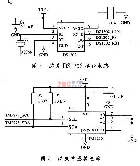 系統采用芯片DSl302為手持測溫儀提供實時時鐘,該芯片是DALLAS公司推出的涓流充電時鐘芯片,內含有一個實時時鐘/日歷和3l B靜態RAM,可提供秒、分、時、日、月、年等時間信息。DS1302與單片機之間能簡單地采用同步串行的方式即I2C協議進行通信,具體電路如圖4所示,僅需用到三個端口就可實現對該芯片的讀寫控制,工作時功耗很低保持數據和時鐘信息時功率小于1 mW。