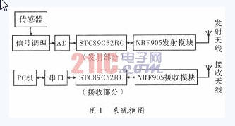 文中利用51單片機和無線數據收發芯片nRF905構成無線數據傳輸系統,給出了硬件和軟件設計方案。其數據傳輸過程是:從傳感器輸入的模擬信號經AD采集后,將數據輸入單片機,然后單片機將該發送數據,通過SPI接口發送給nRF905,nRF905將數據自動加上前導碼和CRC碼后將數據包發送。當接收端的nRF905接收到有效數據后,DR置高;單片機檢測到DR為高電平后,復位TRX_CE引腳,使nRF905進入空閑模式,通過SPI接口從nRF905中讀出接收數據,然后通過串口在上位機顯示。文中主要介紹的是51單片機軟件模擬SPI和無線數據收發這兩個部分。圖1是該系統的總體結構框圖。