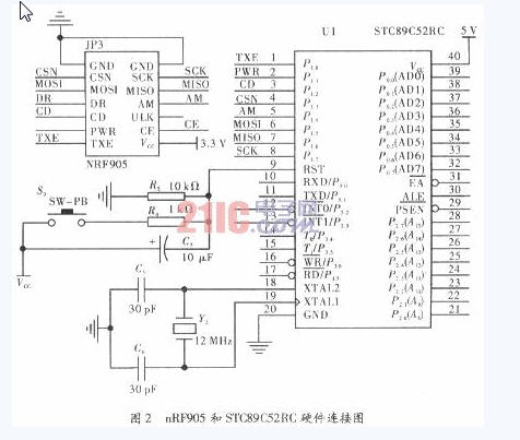 SPI(SerialPeripheralInterface串行外設接口)總線系統是一種同步串行外設接口,它可以使MCU與各種外圍設備以串行方式進行通信以交換信息。該接口一般使用4條線:串行時鐘線(SCK)、主機輸入從機輸出數據線MISO、主機輸出/從機輸入數據線MOSI和低電平有效的從機選擇線SS。可見SPI總線只需要少數的幾根線,就可以實現與具有SPI總線硬件接口功能的各種器件進行通信,并且用SPI總線接口簡化電路設計,節省許多I/O口線供其它功能使用,提高了設計的可靠性。而對于一些不具有SPI硬件接口的器件,可以用I/O口線來模擬SPI。由于nRF905射頻收發模塊是通過SPI接口由MCU控制的,而采用不具有SPI接口的單片機,只能通過單片機的I/O口來模擬SPI總線接口,實現無線通信系統的設計。這樣當傳輸速度要求不是太高時,使用I/O口模擬SPI總線,既可以增加應用系統接口器件的種類,同時還提高系統的性能,節約成本。