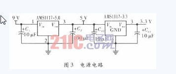 本系統使用兩個電源,單片機STC89C52RC使用5V電源,NRF905采用3.3V電源進行供電,然后把STC89C52RC和NRF905共地,否則會出現無法傳輸數據。其中轉換芯片分別使用AMSlll7-5.0轉5V芯片和AMSl117-3.3轉3.3 V芯片電路圖,如圖3所示。電源電路使用220 V的交流電適配器輸出的9 V直流,經C1濾波進入AMSlll7-5.0,然后在輸出端接一個100μF的電容進行濾波去耦,從而得到5 V直流電壓供單片機使用;然后5 V電壓接入下一級AMSlll7-3.3電源轉換芯片,輸出3.3 V供NRF905使用。