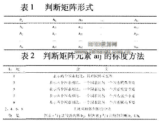 任何系統分析都以一定的信息為基礎,層次分析法的信息基礎主要是人們對于每一層次中各因素相對重要性的判斷。這些判斷通過引入合適的標度,用數值表示出來,形成判斷短陣。判斷矩陣表示針對上一層次某個元素,本層次與其有關因素的相對重要性的比較。若A層次的上一層次P的因素P 與A層次中的A1,A2,...,An有聯系,則判斷矩陣形式如表2表示。判斷矩陣的元素aij用薩蒂的1—9標度方法給出(如表1所示)。