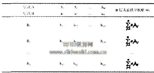 計算同一層次所有因素對于最高層(總目標)相對重要性的權值,稱為層次總排序。這一過程是最高層次到最低層次進行的。若上一層次A包含m個因素A1,A2,......,Am,下一層次B包含B1,B2,......,Bn ,它們對于因素A 的層次單排序權值分別為b1j,b2j,......,b nj,(當Bk與Aj無聯系時,bkj=0),則B層次總排序權值由表4給出。