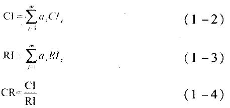 同樣,當CR<0.10時,則認為層次總排序的計算結果具有令人滿意的一致性;否則,就需要對本層次的各判斷矩陣進行調整,從而使層次總排序具有令人滿意的一致性。