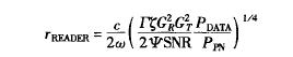 超高頻RFID讀寫器接收機工作時也需要發射機發出無調制的載波,接收機接收到的包括標簽反射信號、天線噪聲、環境反射、發射機直接耦合,以及接收機自身的噪聲等.在標簽能獲得足夠工作能量的前提下,讀寫器的工作距離主要取決于標簽反向散射信號在讀寫器的解調輸出能否滿足最低信噪比要求。根據文獻[3],可用下面的公式來標示讀寫器決定的最大工作距離: