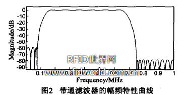 FM0編碼的絕大部分信號功率都在第一零點內,通常第一零點帶寬位置為通信速率的2倍,加入時鐘抖動后,其最大的第一零點帶寬可達通信速率的2.5倍,因此,設置低通截止頻率為650kHz;考慮同步頭的v特征點,可設置高通截止頻率為160kHz,以便在有限的資源條件下盡可能濾除帶外噪聲,圖2為設計得到的帶通濾波器幅頻特性曲線。