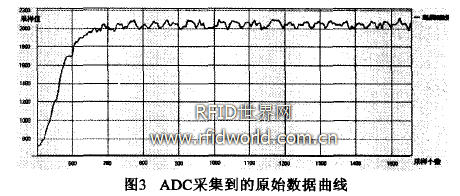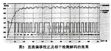 ADC采集的原始數據曲線如下圖3所示(橫軸是采樣個數,縱軸是采樣數據值.下同).由于完整的通信幀數據較多,在此僅僅給出包含同步頭和同步碼的I路前半部分數據及其處理結果