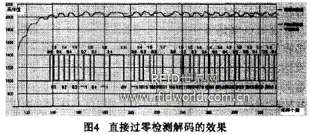 基帶數據解碼方法分為過零檢測和相干檢測兩種,過零檢測工作原理是設定一個閥值,對數據緩沖區內的每個數據樣本都與中值相比較,如果該數據樣本與中值的差值的絕對值大于閥值且大于平均值,就判定為1,否則都判為0,由于該方法的實現簡便易行,甚至利用比較器就可以實現判決.在中低端讀寫器產品上使用廣泛。