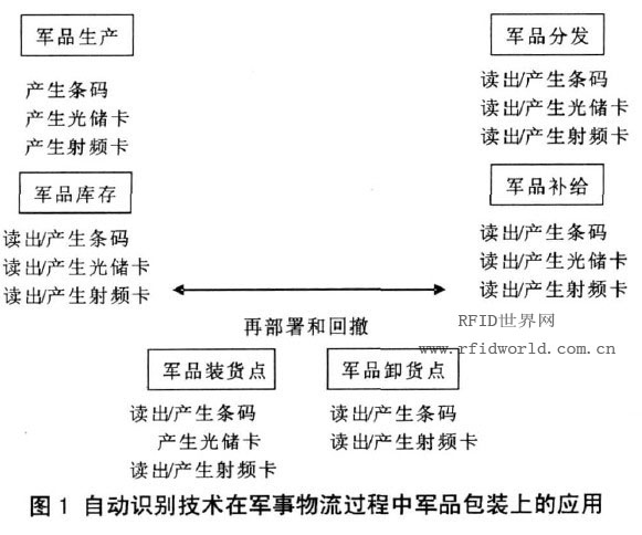 自動識別技術在軍品包裝上的應用,覆蓋了軍事物流的各個環節。主要包括軍品生產、軍品庫存、軍品分發、軍品補給和軍品再部署幾個階段[4]。由于各階段所采用的軍品包裝不同,需要解決的問題也不一樣,因此每個階段所運用的自動識別技術各不相同,其運用方案如圖1 所示。