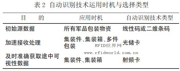 如表2 所示,在自動識別技術的運用時機上,由于條碼可以免去鍵入或其他輸入源數據的手工作業,因此在軍事物流鏈中的所有軍品均應采用條碼來采集其初始源數據,且如果軍品物資僅需加以標識并使之與自動化信息系統中的預置數據相一致,可采用線性條碼,如果自動化信息系統缺乏數據,則可采用二維條碼來充實數據庫;當需要快速、準確地獲取大量詳盡的軍品信息時,可選擇光儲卡作為自動識別技術;當部隊必須確定單個集裝箱的位置和加以重新調度時,或者部隊必須得到遠距離軍品包裝內裝物品的種類時,可采用射頻技術;當部隊在作戰地域內沒有合適的系統或相應的信息基礎設施時,也可用射頻識別技術來保證部隊獲取軍品物資的相關信息。