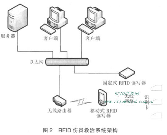 取左胸前,也可以作為一個功能模塊嵌于其他隨身攜帶的裝備中。如圖2 所示,傷員救治系統由5 部分組成,包括服務器(server)、客戶端(client)、移動式RFID 讀寫器、固定式RFID 讀寫器和單兵RFID 識別卡。系統采用B/S 模式。