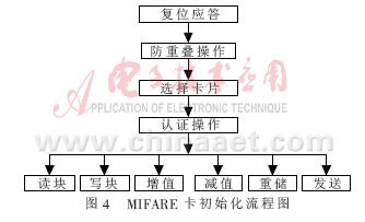 單片機與MIFARE卡進行通信是通過天線發送協議IS014443A所規定的指令代碼和數據格式來實現的。例如向卡片發送數據是通過向讀卡器核心模塊RC522內的FIFOData寄存器寫入待發送數據,Command寄存器裝入命令Transceive的代碼0x1e,RC522就會將數據發送出去,卡中返回數據則存放在FIFOData寄存器中,由單片機讀取后寫入串口通過GPRS發送到控制中心。讀卡器對MIFARE卡片的操作流程如圖4所示[4]。