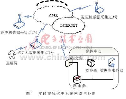 考慮到保安人員工作環境復雜和人員素質參差不齊,巡更手機易造成人為損壞,維護起來工作量大。本文介紹了一種新型的實時在線巡更系統,該系統使巡更管理更為科學、方便,對監督巡更人員,保障園區安全起到極其重要的作用。在實際使用時,由巡更員隨身攜帶一張智能卡,按事先設定好的巡更線路巡查保護區域,在指定的時間內到達巡更點,當巡更員經過事先設定的巡更點時,巡更機自動識別并讀取保安身上的智能卡信息,由巡更機通過GPRS將保安ID、到達時間等工作記錄信息發送到總監控室,管理人員在中心電腦上可以及時看到巡更員巡邏情況,從而實現在線巡更管理功能。