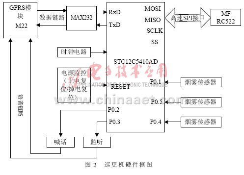 巡更機的硬件部分主要由處理器、GPRS模塊、紅外傳感器等組成。處理器采用STC12C5410AD,這是一款增強型8051內核的單片機,有多種封裝形式,比普通8051核單片機快8~12倍,硬件看門狗,具有1個全雙工異步串行通信口,1個高速SPI通信端口,10位ADC,8通道且價格便宜,特別適合小型嵌入式終端使用。GPRS模塊采用BENQ 22,此模塊是臺灣明基公司GSM/GPRS模塊產品系列的主導產品,該模塊為帶TCP/IP協議的900/1 800/1 900三頻段工業模塊,主要用于無線公話、車載系統、監控、防盜系統。由于該模塊內嵌了TCP/IP協議,這大大降低了對整個系統硬件和軟件的要求。BENG22模塊的工作電壓為3.2 V~4.2 V,通話時最小功耗為230 mA最大為260 mA,待機時功耗小于6 mA;支持3 V的SIM卡,支持語音、短信息、傳真功能,支持GSM和GPRS 2種模式。讀卡器中MF RC522是Philips公司最新推出的一款非接觸式低功耗讀寫基站芯片,它是應用于13.56 MHz非接觸式通信中高集成讀卡IC系列中的一員。該讀卡IC系列利用了先進的調制和解調概念,完全集成了13.56 MHz下所有類型的被動非接觸式通信方式和協議。MF RC522支持ISO14443A所有的層,傳輸速度最高達424 Kb/s,具有3種主機接口方式:SPI模式、UART模式、I2C模式。本設計采用SPI模式進行讀卡器與單片機通信。巡更機硬件框圖如圖2所示。