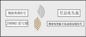 當裝有智能卡的頭盔在距離0~10米范圍內接近JX0502讀寫器時,讀寫器受控發出微波查詢信號,安裝在頭盔表面的智能卡收到讀寫器的查詢信號后,將此信號與智能卡中的數據信息合成一體反射回智能卡讀出裝置。反射回的微波合成信號,已攜帶有智能卡數據信息。讀寫器接收到智能卡反射回的微波合成信號后,經讀寫器內部微處理器處理后即可將智能卡貯存的識別代碼等信息分離讀取出來。
